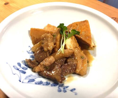 これはこの辺りの猟師の定番料理。脂ののったイノシシ肉をぶつ切りにし、酒、砂糖少々、味噌で炒め煮に、最後にネギをたっぷりと。酒にもご飯にもぴったり。イノシシの美味しさを純粋に楽しめる料理だと思います。 今回はネギではなく、タケノコと厚揚げと一…