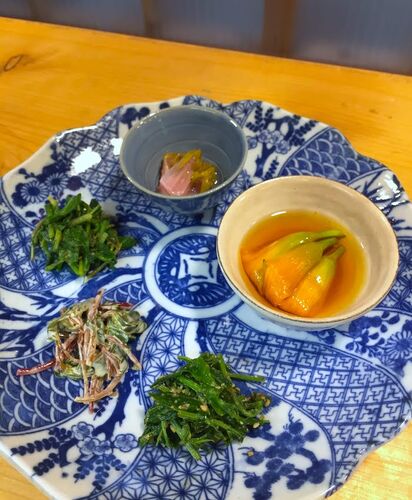 夏のコース料理をご注文いただきました。 お出しした前菜プレートをご紹介いたします。 奥から時計回りに ・ホタルブクロの甘酢漬け ・ヤブカンゾウの蕾のおひたし ・ツユクサの胡麻和え ・スベリヒユのマヨネーズ和え ・クコの酢味噌和え お花も入り、色鮮…