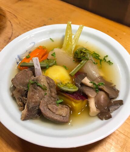 本日のコースでお出しした料理です。2時間ぐらい煮て柔らかくなった鹿の骨つきあばら肉を、カブ、サツマイモなどと一緒に煮込みます。味付けは数種類のハーブと塩胡椒のみ。仕上げに春先に採れたコゴミをピクルスにしておいたものをトッピング。酸味がプラ…