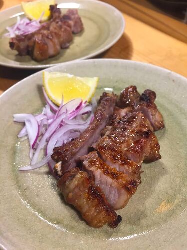 イノシシの骨つきあばらにくを特製タレに数日漬け込み、遠火でじっくりと焼き上げました。 外はカリッと、中はジューシー。切ると肉汁が滴ります。イノシシの脂の甘さがたまりませんねー。 本日のコース料理でご提供いたしました。