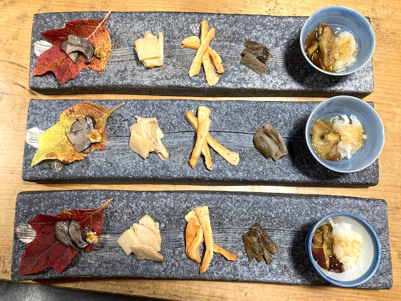 2022-11-20 きのこづくしの前菜 おすくに きのこ料理 コース料理 秋の料理 本日のコース料理の前菜、天然きのこの盛り合わせ。 左から ・クロカワ・オオモミタケ・マスタケ・ショウゲンジ・ハナイグチ の5種類。それぞれ風味も食感も違って面白いですね。そろそろきのこの季節も終わり、この後はジビエと保存食中心のメニュー構成になっていきます。