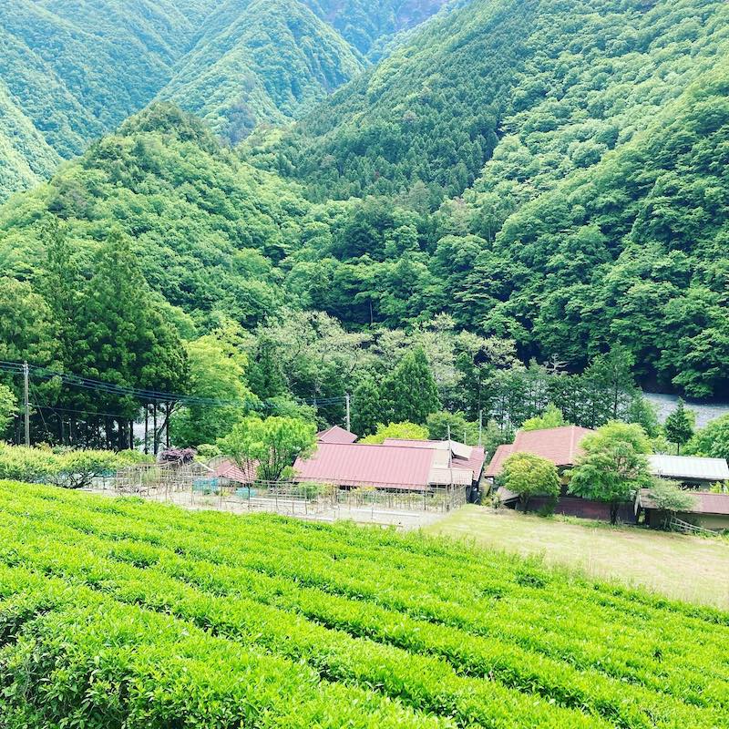 場所は同じ町内の雨畑地区。おすくにでお出ししている雨畑紅茶の産地です。斜面に広がる茶畑が美しい。